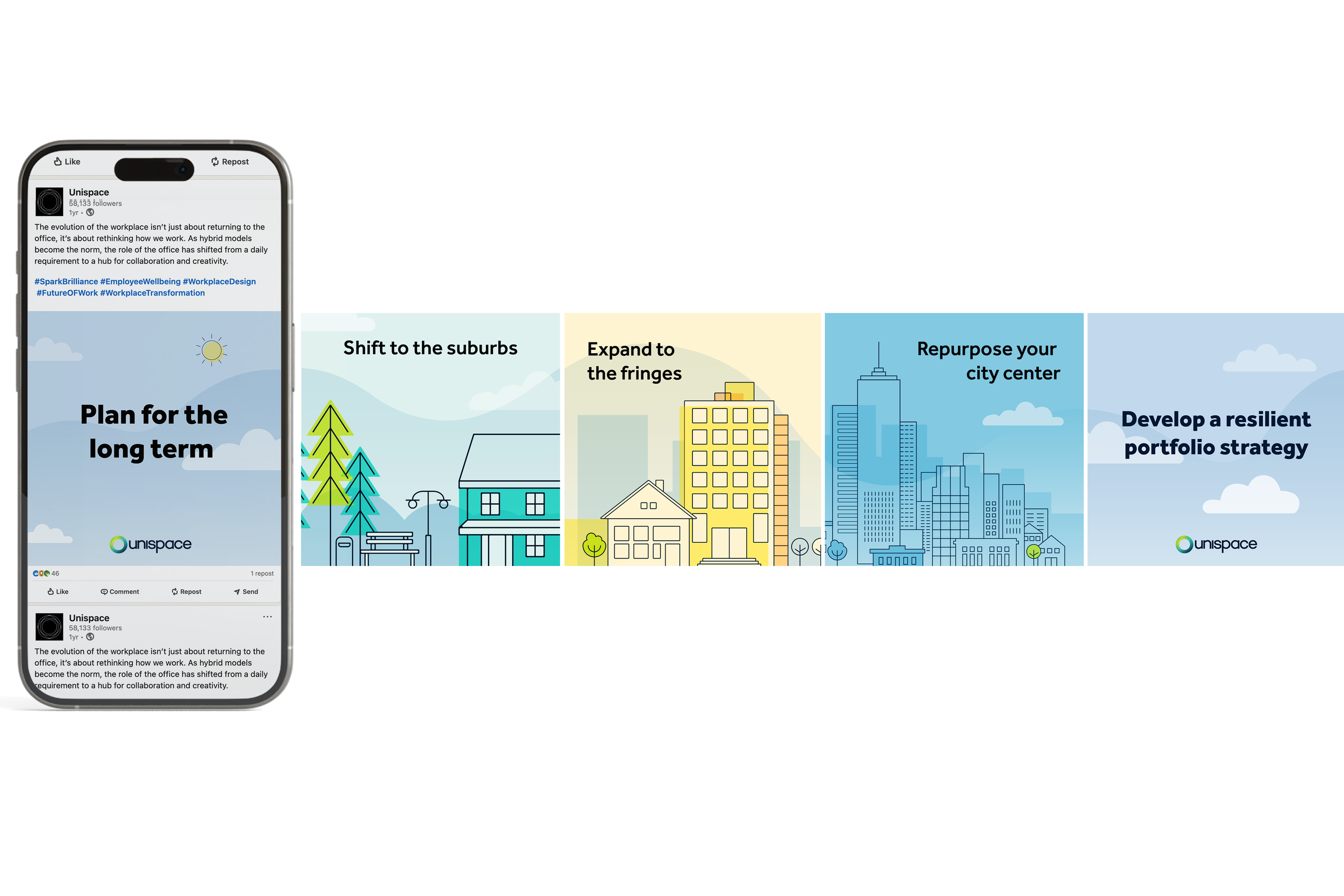 RE:location is a thought leadership series exploring how hybrid work and shifting employee needs are redefining workplace strategy and commercial real estate. The challenge was to translate these insights into visually engaging, accessible content that could perform across both editorial and social platforms.